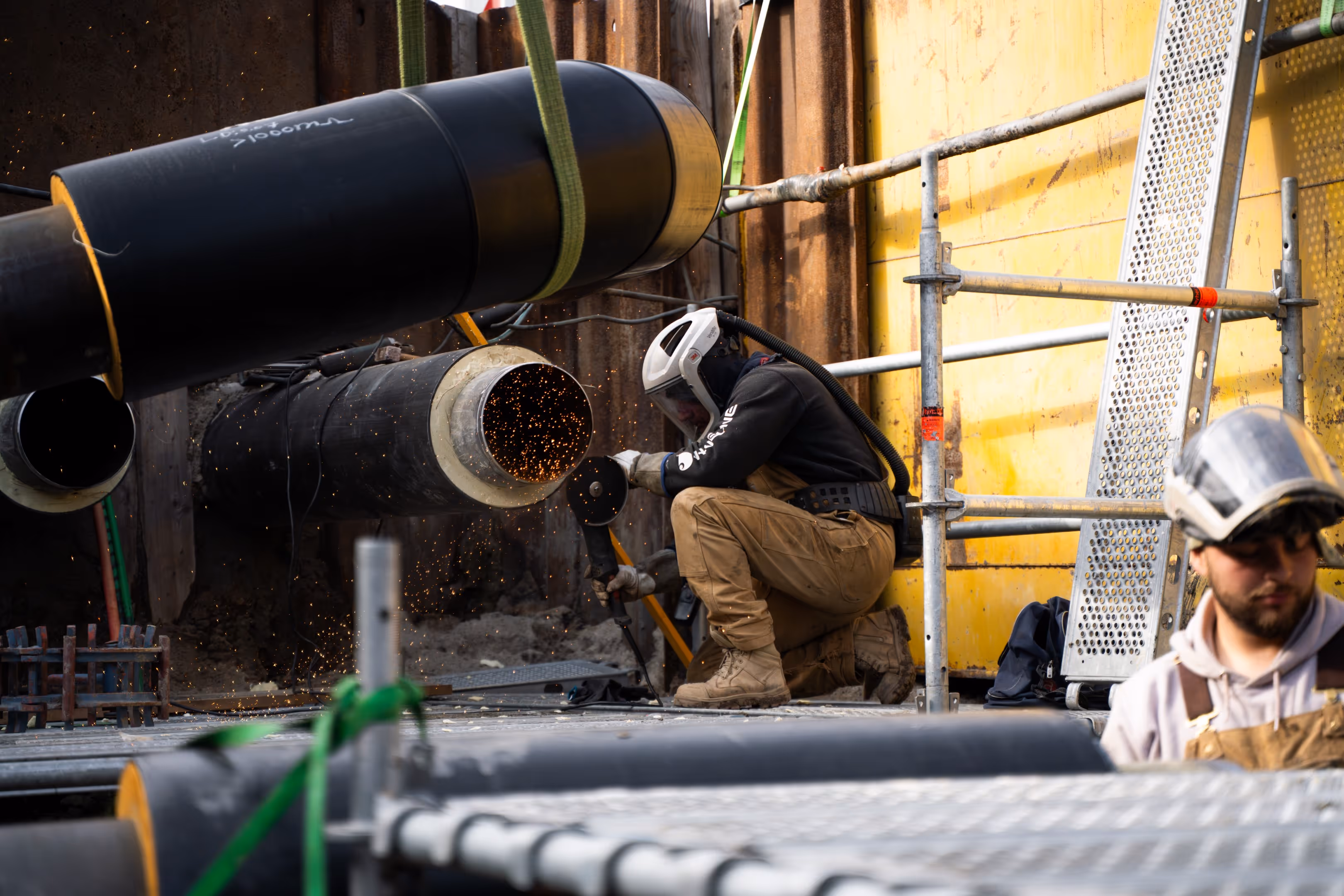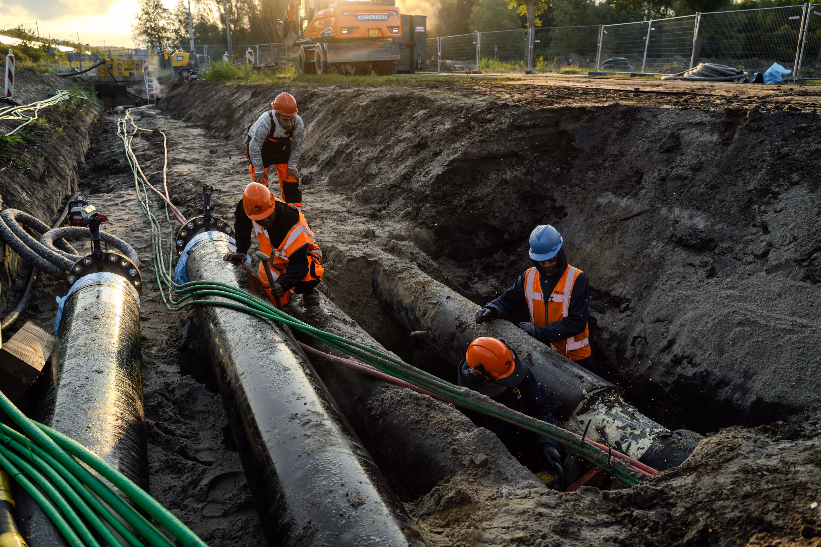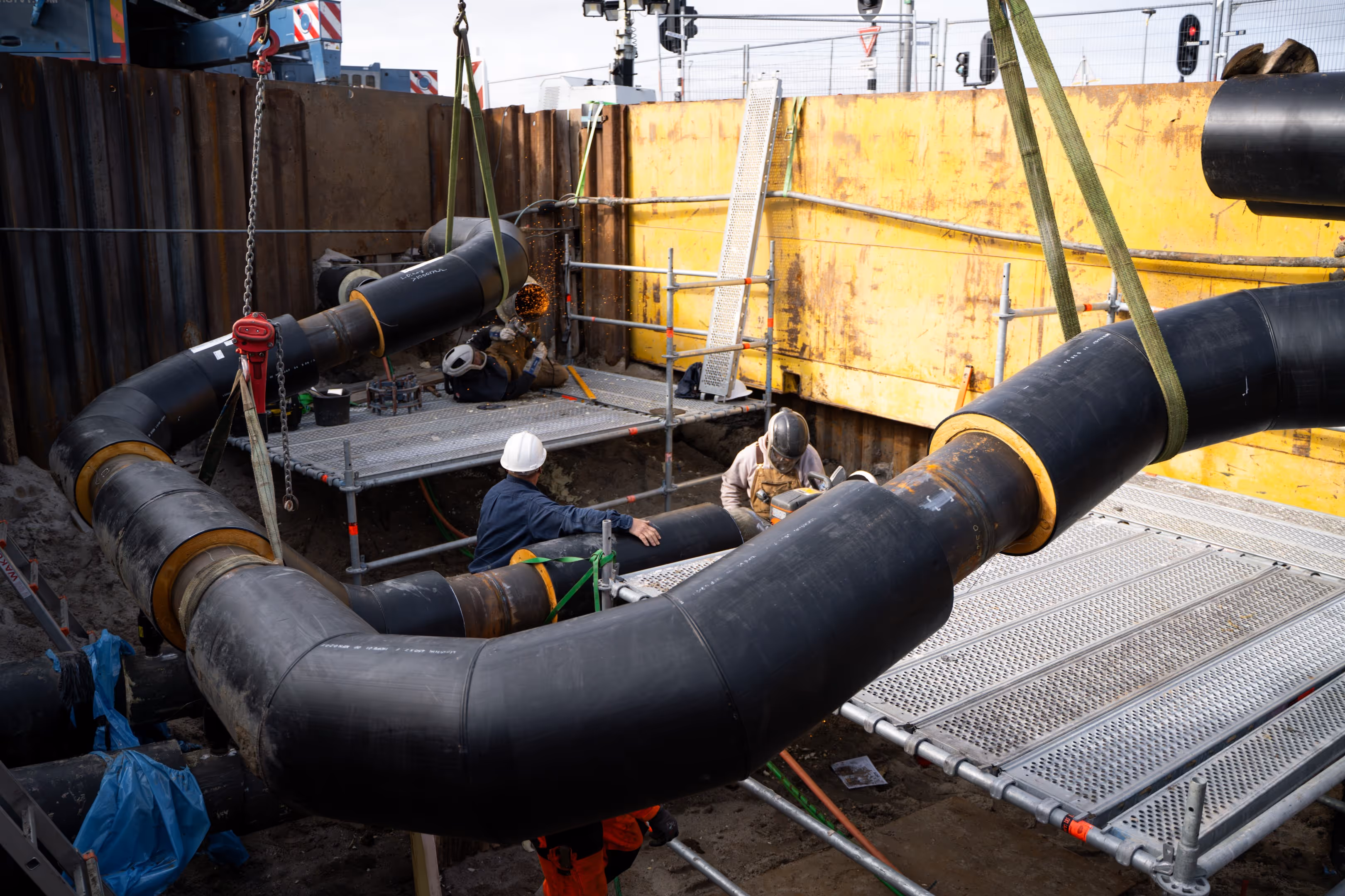 Een bijzonder aspect van dit project was het opnieuw op druk brengen van het net. Nadat alle lassen waren voltooid en goedgekeurd via TOFD-inspecties (een nauwkeurige lascontrolemethode) werd het warme water langzaam teruggebracht in de leiding. Dit gebeurde via een omloop tussen retour en aanvoer, zodat het systeem gelijkmatig kon opwarmen en geen spanningen op de nieuwe bochten of lassen zou ontstaan.